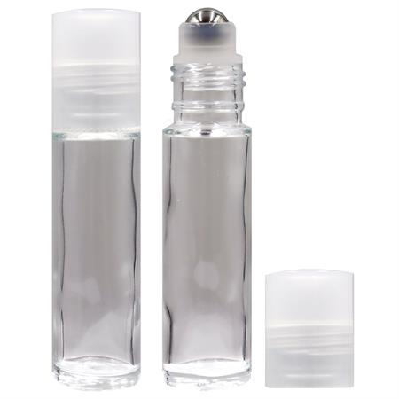 10 ml (1/3 ounce) size clear glass roller ball applicator with metal ball and plastic cap. Ideal for DIY essential oil blends and perfumes.